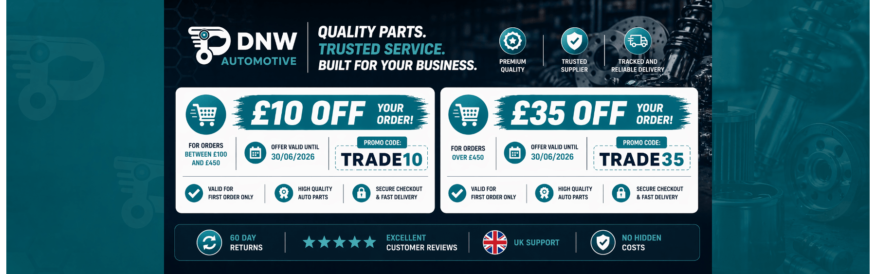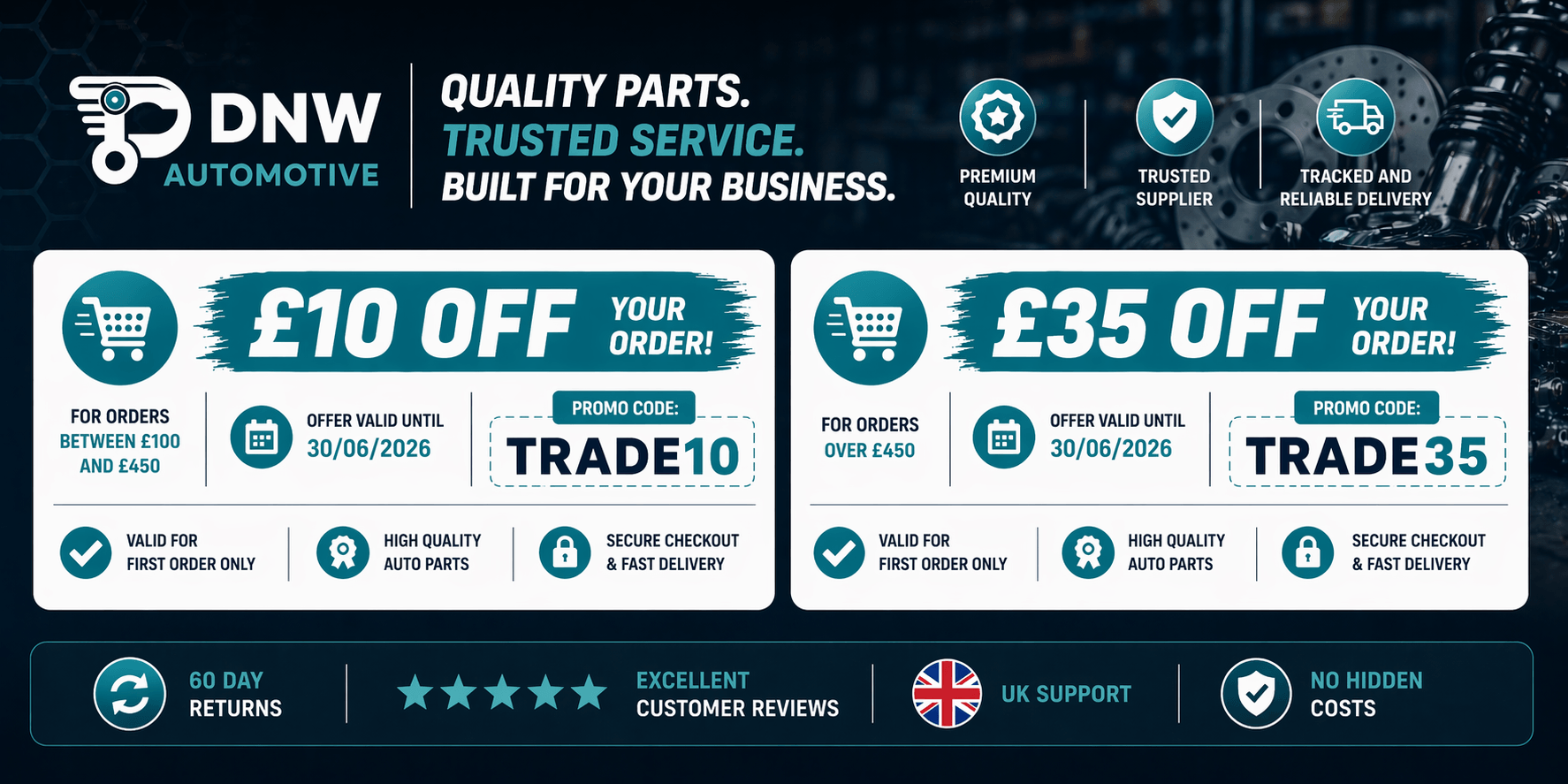 Our customers are encouraged to prepare a VIN or registration number (UK only) when contacting us. Our team will find the exact fitting for your vehicle if you are unsure. We offer discounts for bulk buyers and registered customers. The price discounts depend on the frequency and size of orders and are normally discussed individually. Ocassionally we issue promotional codes and we encourage our customers to use these on our website.